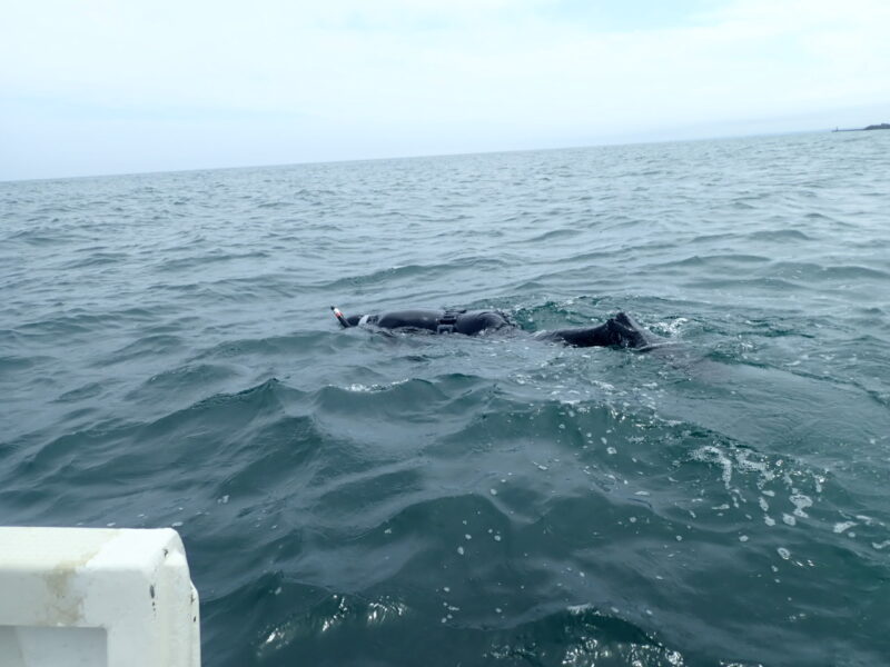 アワビ種苗の出荷が始まっています。 2021年7月19日 6月9日から栽培漁業センターで飼育し、放流サイズに育ったアワビ種苗の出荷が始まりました。 7月15日(木)は平磯漁港地先で漁業者さんによる潜水手撒き放流が行われ、3cmサイズのアワビ種苗約4万個が放流されました。 今年度は、8月末までに大洗以北の漁協に247,400個を出荷予定です。各地先に放流されたアワビ種苗は3年後、殻長11cmに育ち、漁獲対象となります。 アワビ種苗(大きさ約30mm) 放流作業の様子① 放流作業の様子②