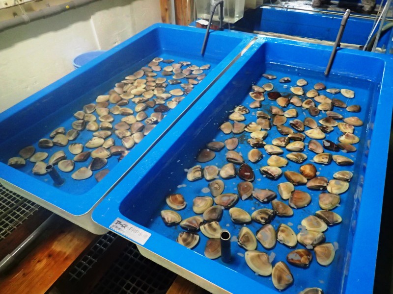 二枚貝棟 建物床面積863㎡、幼生飼育水槽(パンライト水槽1m3×14面)、稚貝飼育室(多段式水槽×14基)、餌料培養室(50リットル水槽×56面、パンライト水槽1m3×46面) 鹿島灘はまぐりの採卵、幼生飼育、稚貝飼育、餌料培養を行います。 関連施設と飼育作業 採卵場 採卵 幼生飼育室 幼生飼育 稚貝飼育室 多段式水槽での稚貝飼育 多段式水槽に設置された稚貝飼育水槽 餌料培養室 植物プランクトンの培養 植物プランクトンの培養